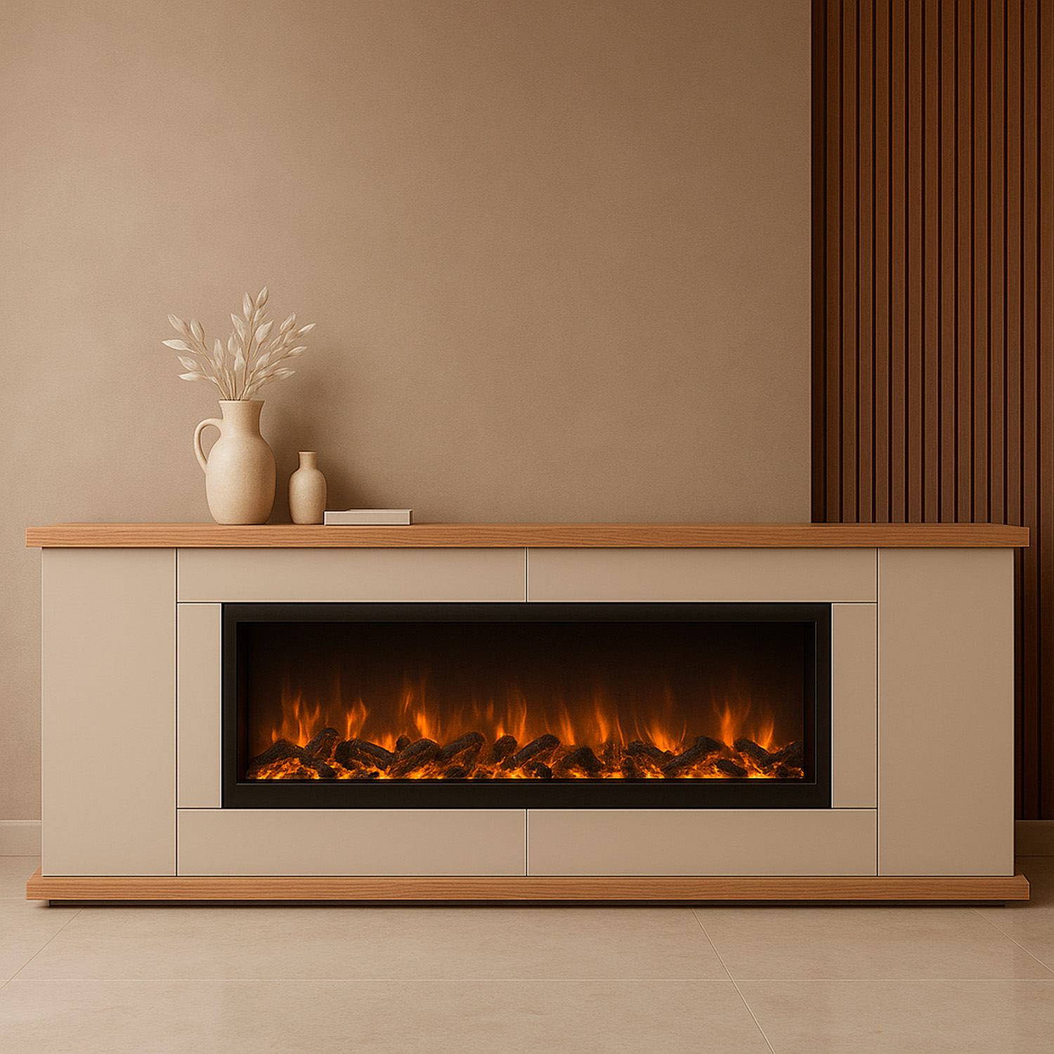 Detalles de roble nudoso: La encimera y los detalles de roble nudoso confieren a la consola DESIO-150 con chimenea eléctrica un aspecto natural y una rica textura, añadiendo un toque de calidez al moderno diseño.