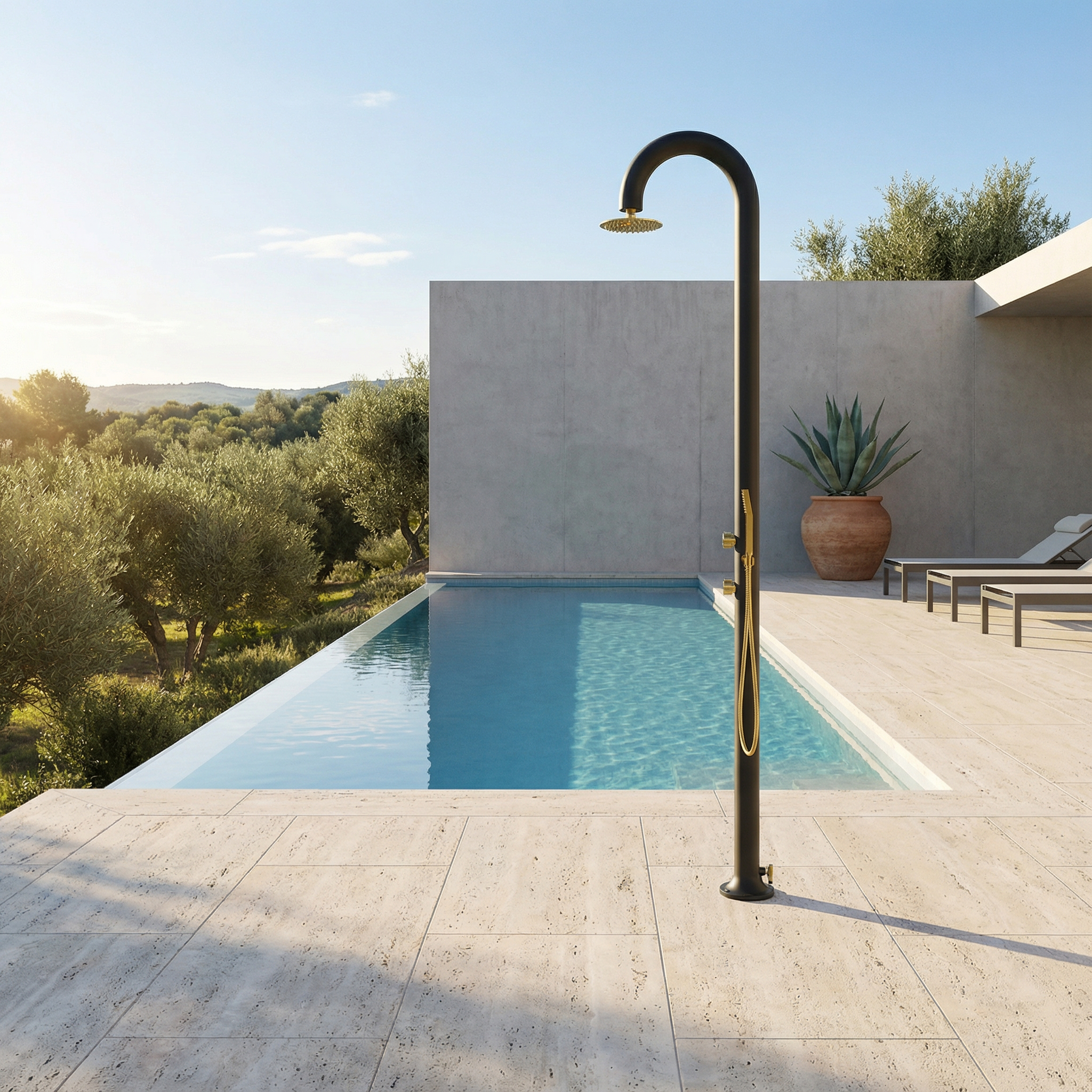 Ya sea instalada en el cuarto de baño de casa, en un jardín o en un entorno profesional como hoteles y resorts de playa, la Ducha Clásica de Aluminio Negro y Oro con Ducha Manual de SINED es sinónimo de calidad, diseño e innovación, lista para transformar cualquier espacio en un oasis de confort y estilo.