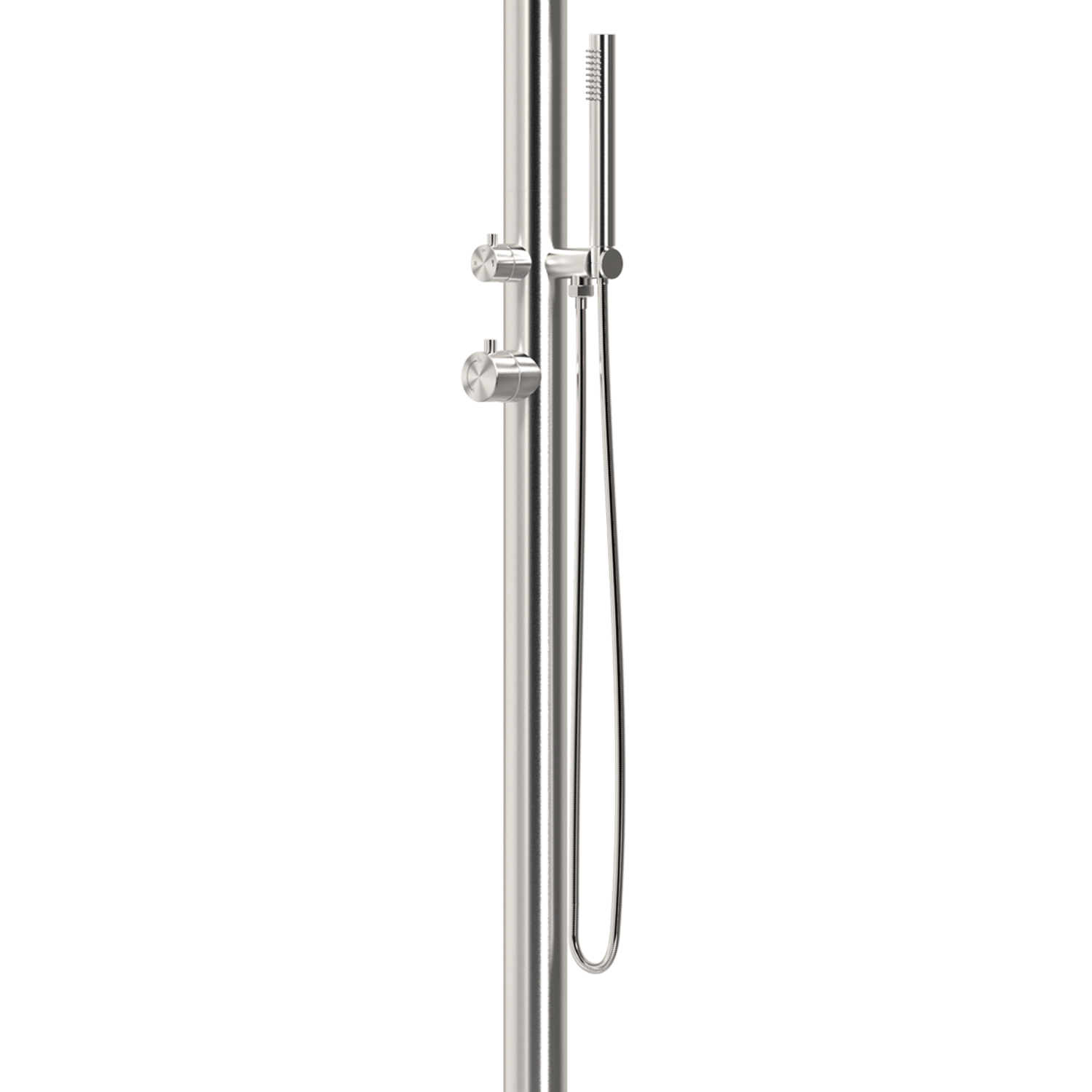 La ducha ALGHERO SINED de acero inoxidable satinado con ducha de mano para exteriores es una ducha de acero inoxidable de alta calidad para exteriores. Fabricada en acero inoxidable satinado Aisi Inox 316L, esta ducha ofrece un sistema de entrada para ducha exterior de agua fría y caliente y tiene una altura de 2289 mm. Es ideal para Hoteles, B and B’s, Campings, Establecimientos de Baño, Baños Domésticos y Spas.