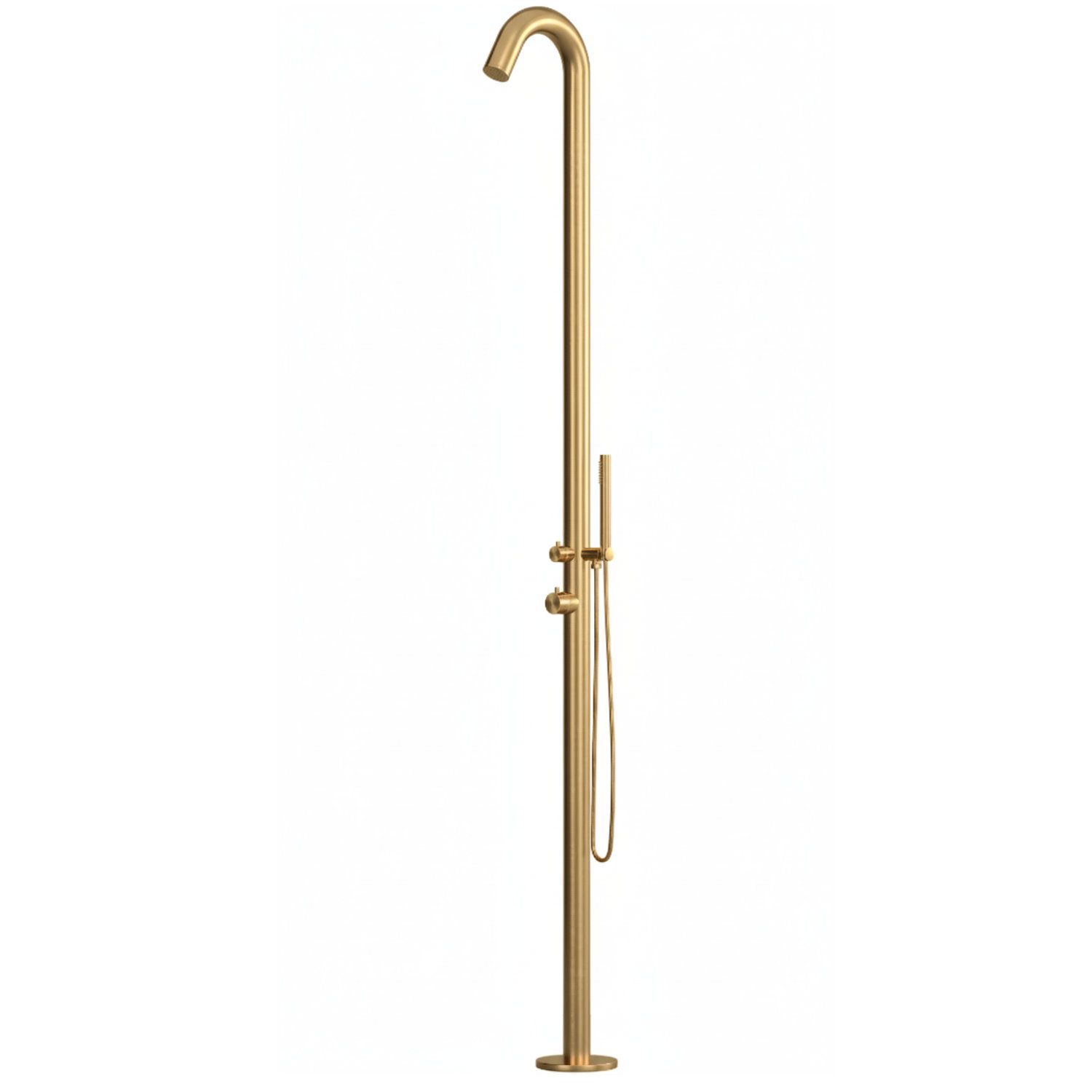 SINED Ducha de jardín de acero Sined Alghero. Acabado Oro. Ducha Con Cuerpo Mezclador Y Mango De Ducha Y Accesorios En Acero Inoxidable Aisi 316l. Ducha para uso interior y exterior. Entrada de agua fría y caliente por la parte inferior. Desde 228cm