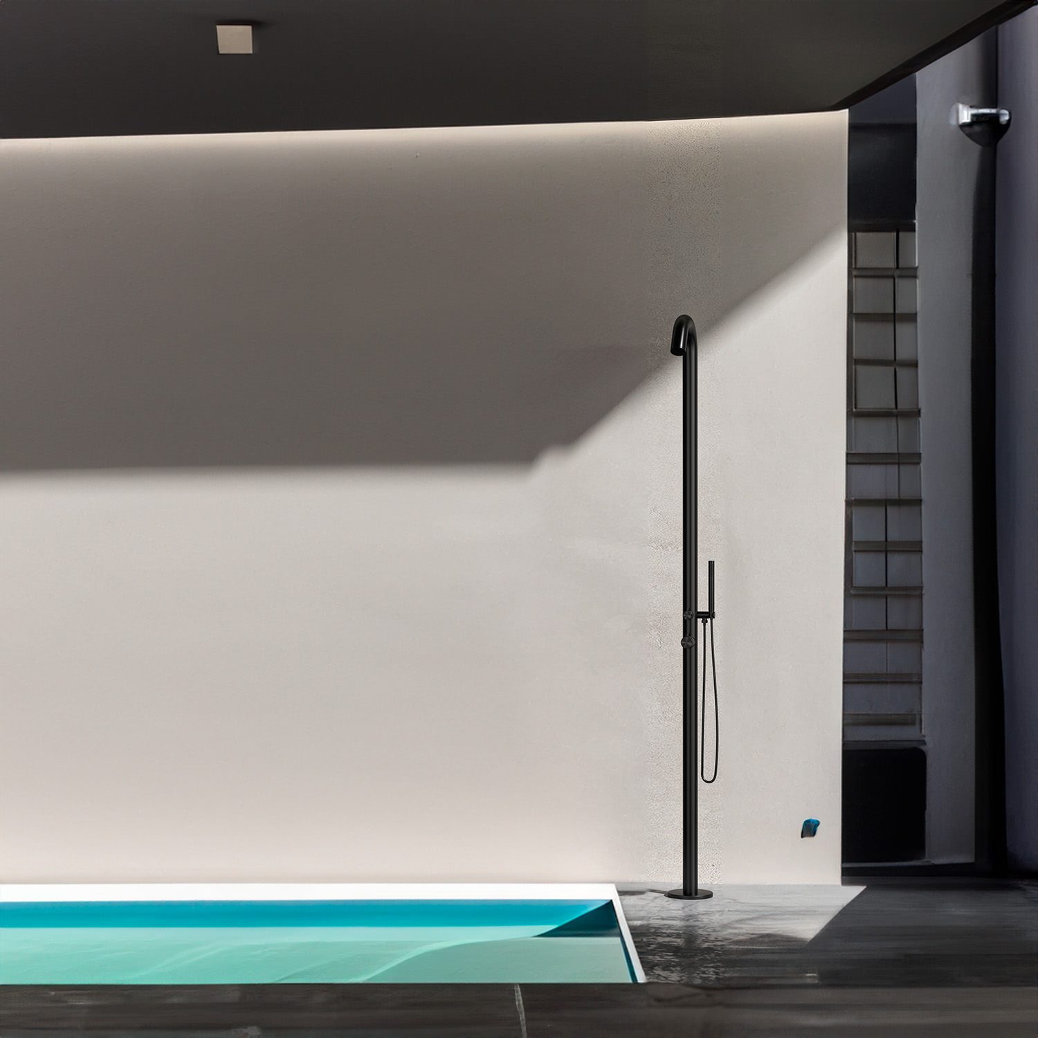 La ducha de exterior de alta calidad de color negro para piscina modelo Bosa es una ducha en Acabado satinado Aisi Inox 316L con entrada de agua caliente y fría de 60 mm de diámetro
