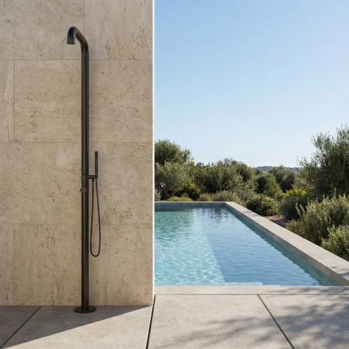 Ducha de exterior de acero inoxidable de alta calidad. Con ducha de mano para exteriores el modelo BUDONI es una ducha en acero inoxidable satinado Aisi Inox 316L con entrada de agua caliente y fría. La ducha de exterior negra es excelente para uso comercial, privado, para piscina exterior-interior, jardín o para el baño de casa.