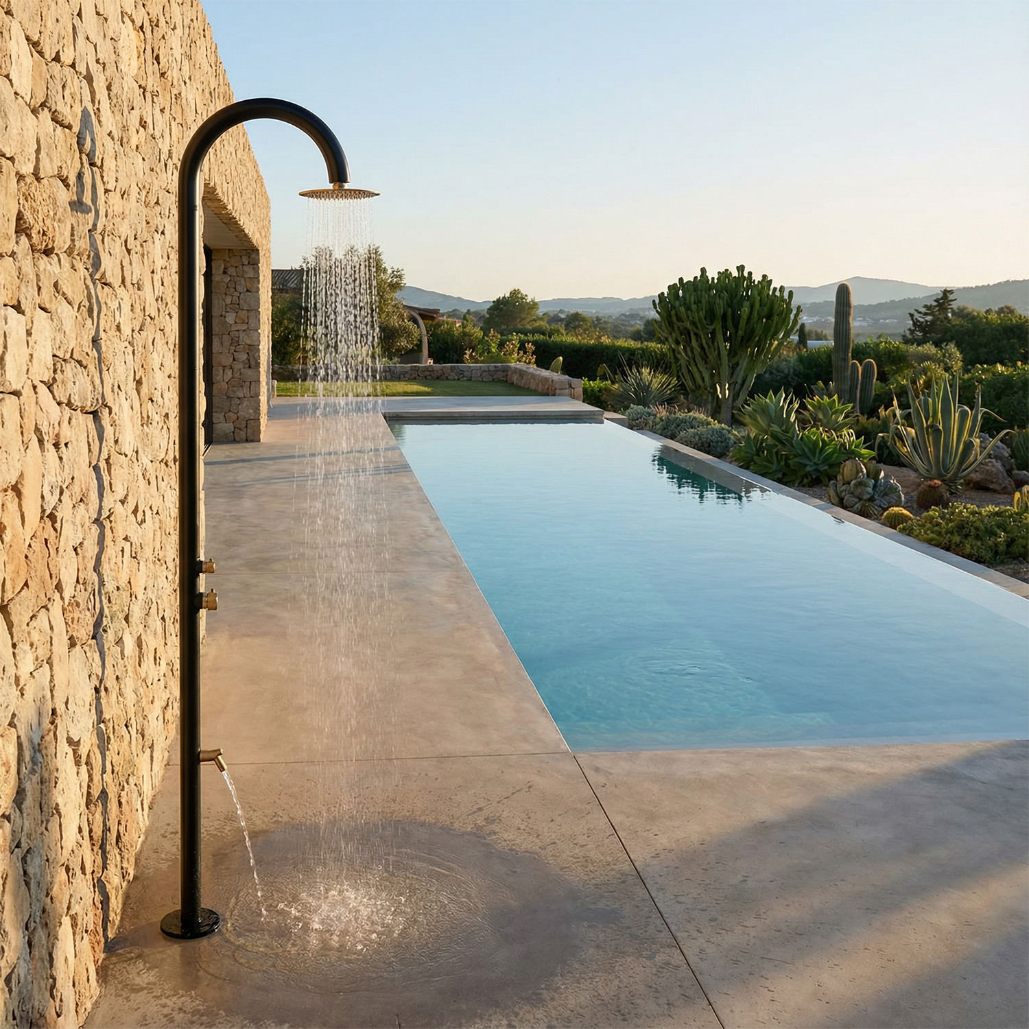 - 1-DUCHA PALAU NEGRA DE ALTA CALIDAD: La ducha negra modelo PALAU con lavapiés es ideal para cualquier instalación exterior, ofreciendo elegancia y funcionalidad en jardines, piscinas y baños domésticos.