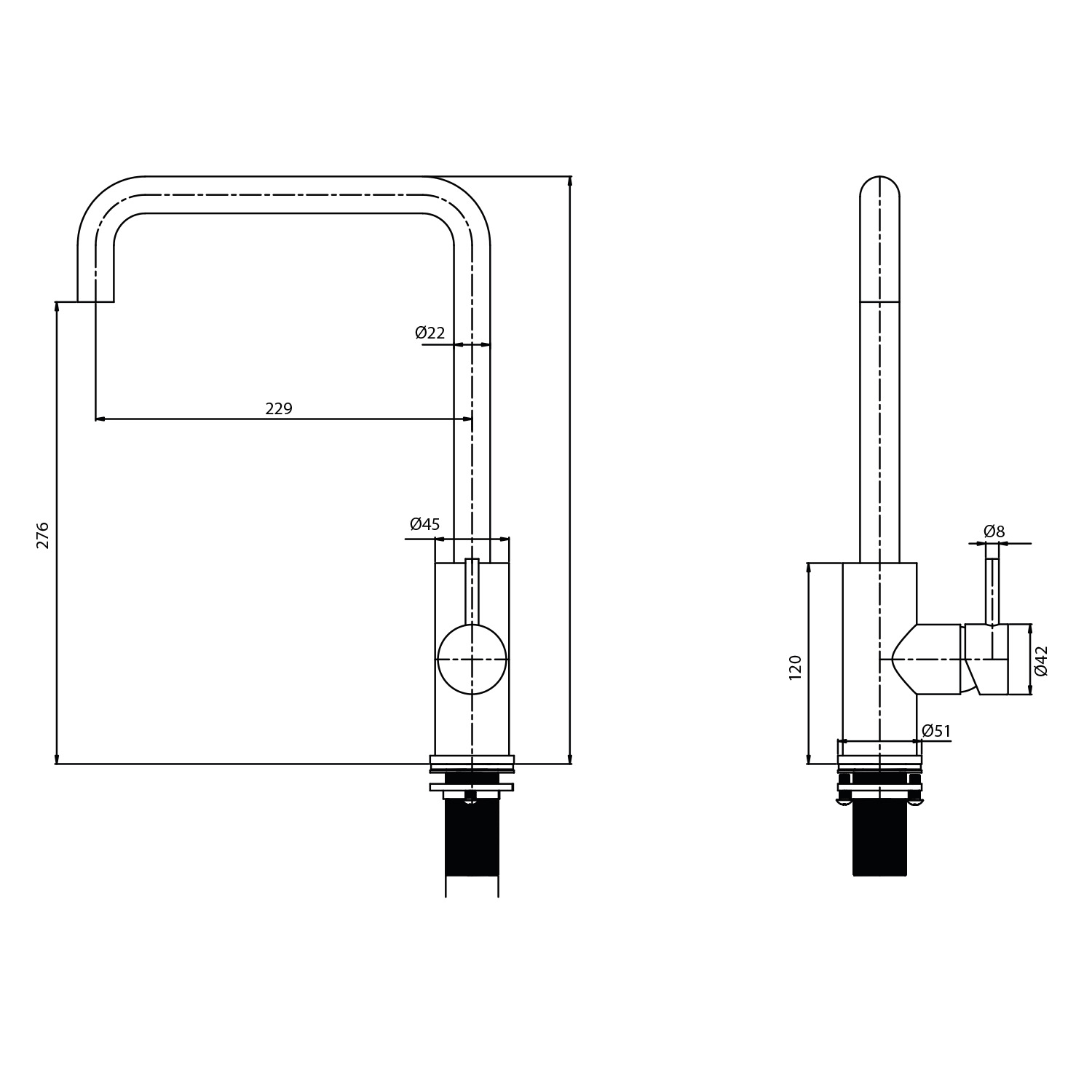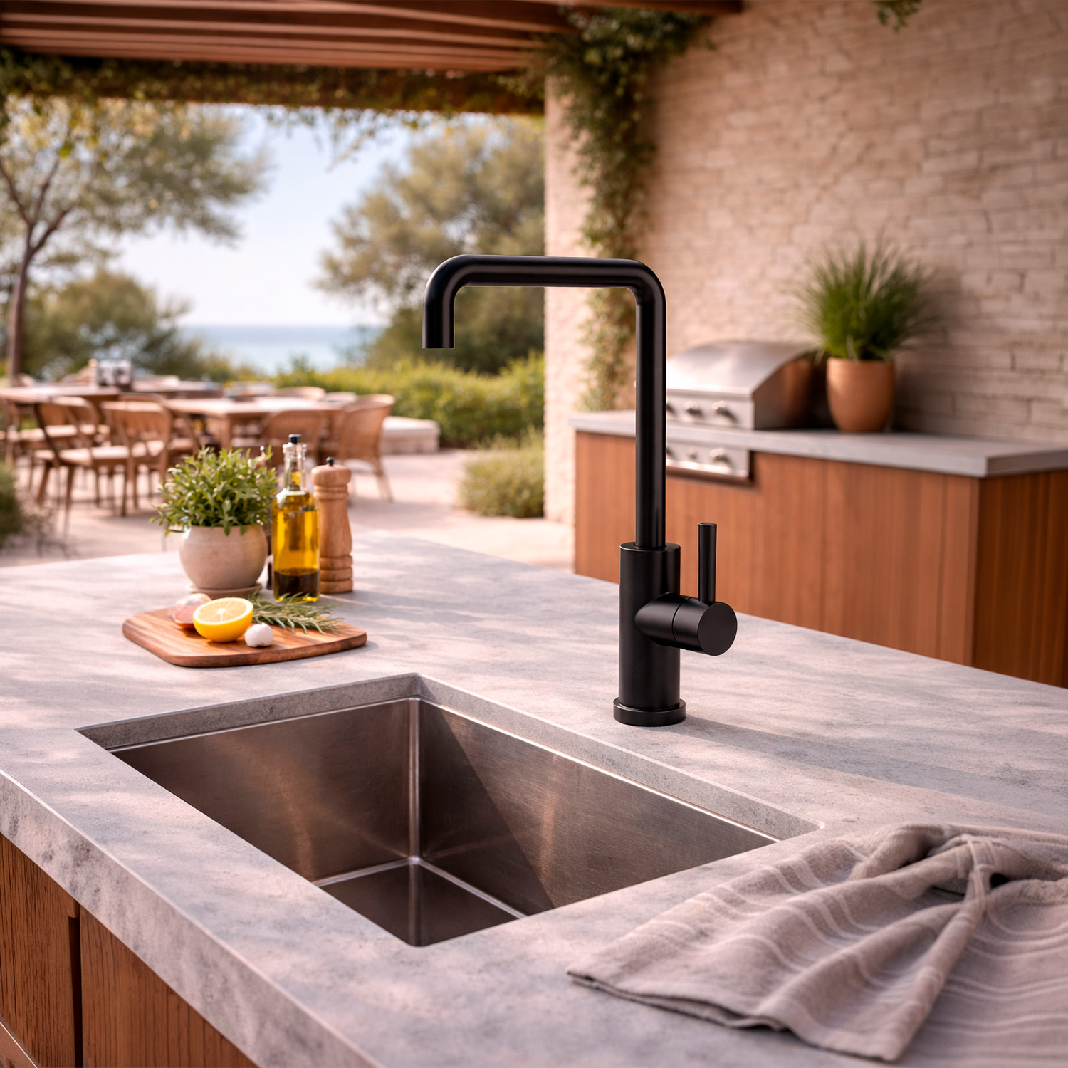 Razón Social grifería de cocina en acero inoxidable 316L negro resistente a la corrosión diseno moderno y funcional para uso prolongado modelo LEVANTE QUADRO