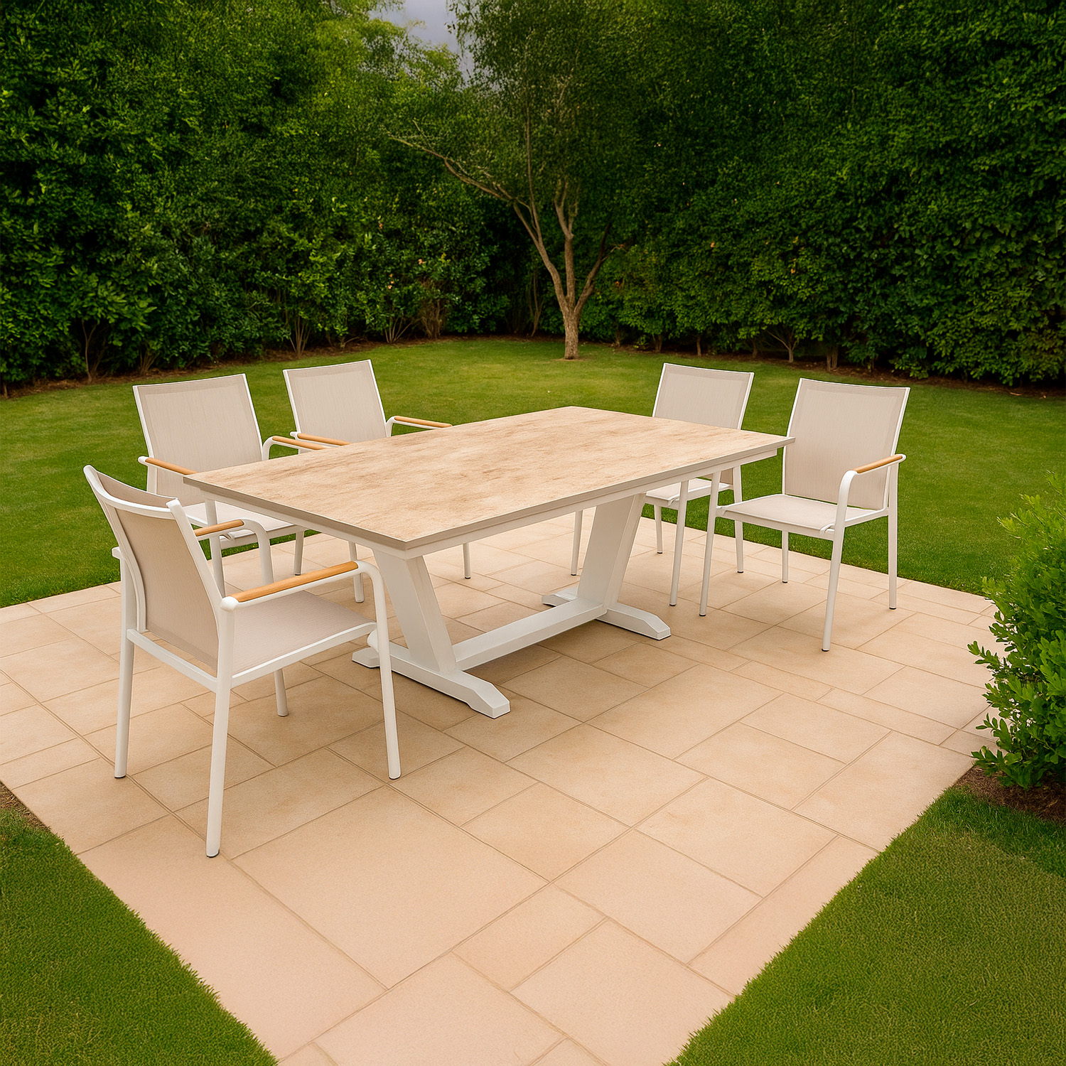 SINED Mesa Extensible 180-280 cm Crema Travertino con Superficie de Cerámica Kedra y Estructura de Aluminio – TAVOLO-GIARDINO-180-280-PRALINE