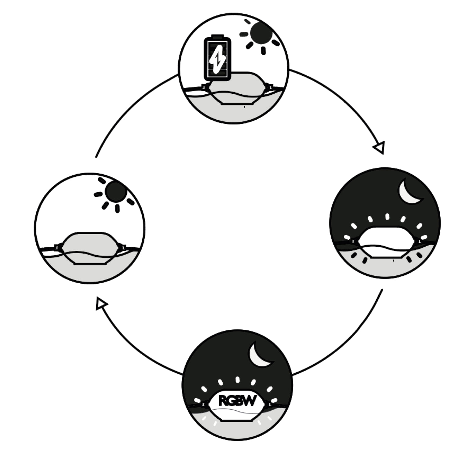 Boya flotante brillante fabricada en PE blanco opaco. La boya se recarga sola con la luz solar, sin necesidad de cable de alimentación.